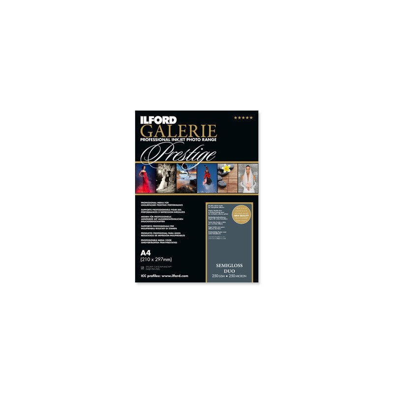 ILFORD GALERIE Prestige Semigloss DUO est un vrai support à, couche résine double face au fini professionnel semi-brillant. Le papier a une teinte photographique naturellement blanche pour produire une superbe gamme de couleurs et des tons chairs parfait. Un support parfait pour créer des albums de mariage, des portfolios, des livres photos, des calendriers ou encore des invitations de toute première qualité. Excellente compatibilité avec toutes les imprimantes jet d'encres performantes à encres pigmentaires ou à base de colorants.
