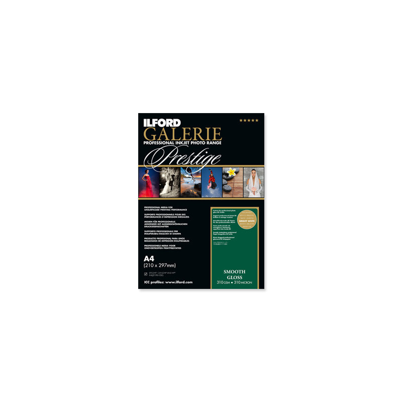 Le papier ILFORD GALERIE Prestige Smooth Gloss est doté de la toute dernière génération de couche nanoporeuse HDR (High Dynamic Range) optiquement transparente qui, couplée aux récents progrès dans la confi guration des couches réceptrices d'encre nanoporeuses, en fait un support de référence pour la production d'images d'une superbe luminosité, d'une grande netteté avec un excellent espace colorimétrique. La base haute densité de grammage élevé et la surface lisse et brillante donnent l'aspect et la tenue d'une épreuve photographique de qualité. Avec l'avantage supplémentaire d'un "toucher sec" en sortie d'imprimante, ce support brillant constitue le "choix des professionnels". Smooth Gloss est compatible avec toutes les imprimantes jet d'encre performantes utilisant des encres à colorants ou à pigments.
