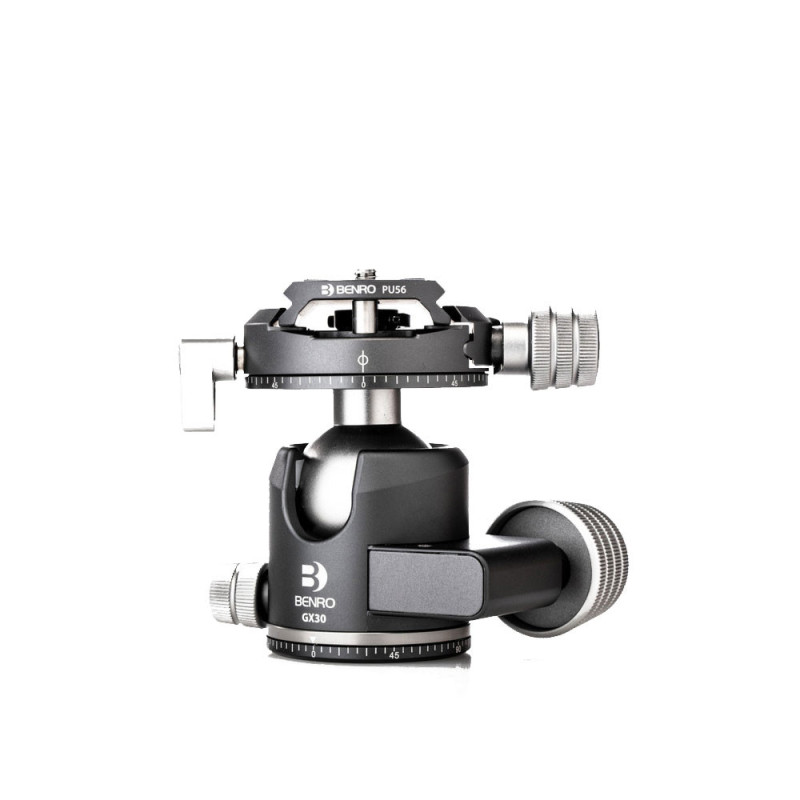 La rotule BENRO GX30 convient aux appareils photo assez lourds. Elle peut supporter une charge de 30kg maximum. Ces derniers peuvent être fixés très rapidement et simplement grâce au système à étau compatible avec les plateaux universels QR Arca-Swiss ou au plateau rapide fourni PU56. Cette rotule a un double mode panoramique.
